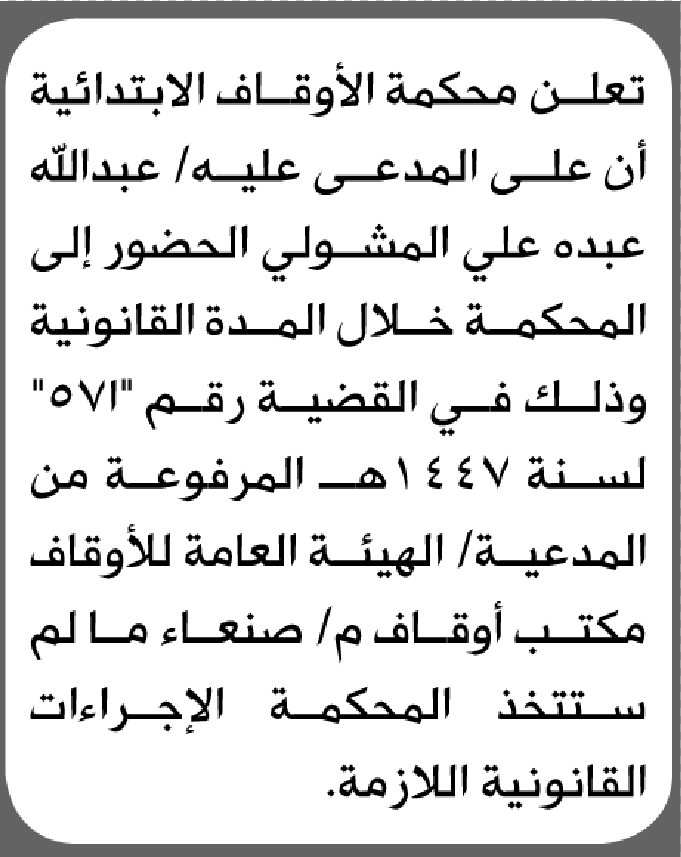تعلن محكمة الأوقاف الابتدائية بأن على/ عبدالله عبده المشولي الحضور إلى المحكمة إعلاناتمحاكم On يناير 17, 2026 Share Share FacebookTwitterWhatsAppTelegramGoogle+البريد الإلكترونيPrint