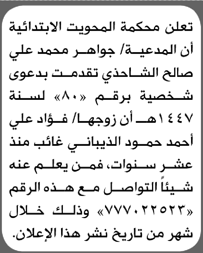 تعلن محكمة المحويت الابتدائية بأن الأخت/ جواهر محمد الشاحذي تقدمت إليها بدعوى عن فقدان زوجها إعلاناتمحاكم On يناير 17, 2026 Share Share FacebookTwitterWhatsAppTelegramGoogle+البريد الإلكترونيPrint