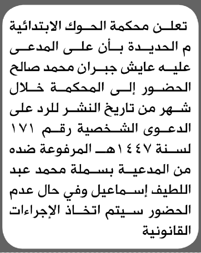 تعلن محكمة الحوك الابتدائية بأن على/ عايش جبران صالح الحضور إلى المحكمة إعلاناتمحاكم On يناير 17, 2026 Share Share FacebookTwitterWhatsAppTelegramGoogle+البريد الإلكترونيPrint