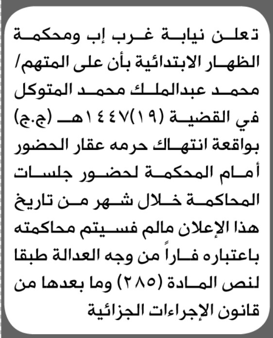 تعلن محكمة غرب إب الابتدائية بأن على/ محمد عبدالملك المتوكل الحضور إلى المحكمة إعلاناتمحاكم On يناير 18, 2026 Share Share FacebookTwitterWhatsAppTelegramGoogle+البريد الإلكترونيPrint