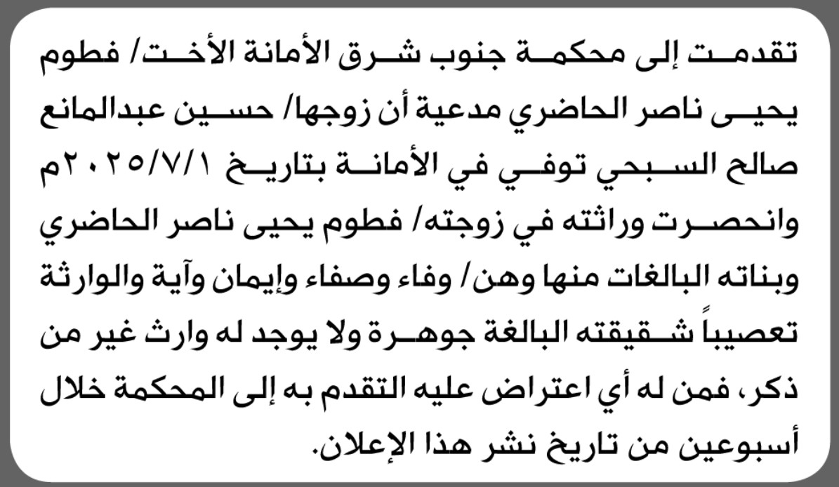 تعلن محكمة جنوب شرق الأمانة بأن الأخت/ فطوم يحيى الحاضري تقدمت إليها بطلب انحصار وراثة إعلاناتمحاكم On يناير 18, 2026 Share Share FacebookTwitterWhatsAppTelegramGoogle+البريد الإلكترونيPrint