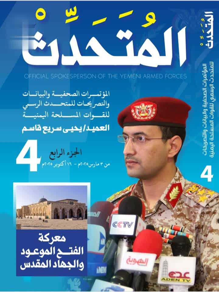 صدر عن دائرة التوجيه المعنوي للقوات المسلحة اليوم الجزء الرابع من كتاب المتحدث الرسمي للقوات المسلحة الذي يوّثق كافة البيانات العسكرية والتصريحات الصحفية للمتحدث الرسمي للقوات المسلحة العميد يحيى سريع وعمليات القوات المسلحة اليمنية المساندة والمناصرة لغزة خلال المرحلة الثانية من معركة “الفتح الموعود والجهاد المقدس” الممتدة من 13 مارس حتى 16 أكتوبر 2025م.