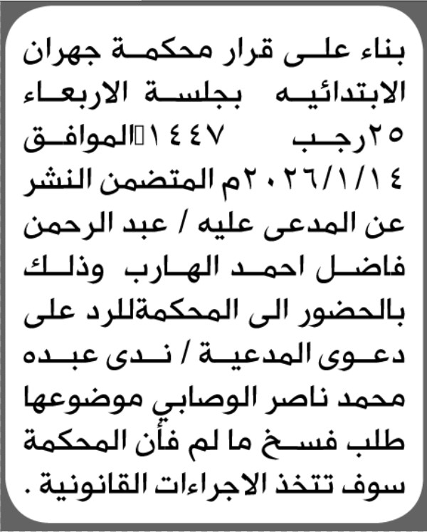 تعلن محكمة جهران أن على المدعى عليه عبدالرحمن الهارب الحضور الى المحكمة إعلاناتمحاكم On يناير 19, 2026 Share Share FacebookTwitterWhatsAppTelegramGoogle+البريد الإلكترونيPrint