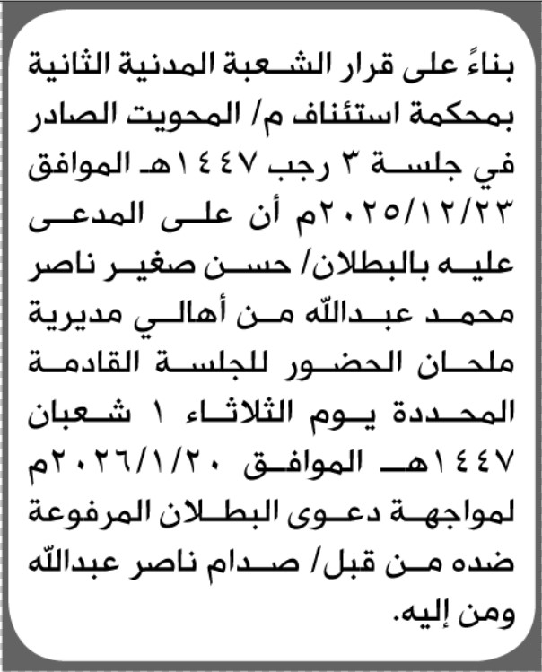 تعلن محكمة استئناف المحويت أن على المدعى عليه حسن صغير ناصر الحضور إلى المحكمة إعلاناتمحاكم On يناير 19, 2026 Share Share FacebookTwitterWhatsAppTelegramGoogle+البريد الإلكترونيPrint