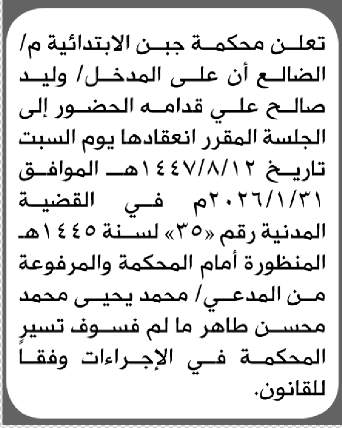 تعلن محكمة جبن أن على المدخل ليد قدامه الحضور إلى المحكمة إعلاناتمحاكم On يناير 20, 2026 Share Share FacebookTwitterWhatsAppTelegramGoogle+البريد الإلكترونيPrint