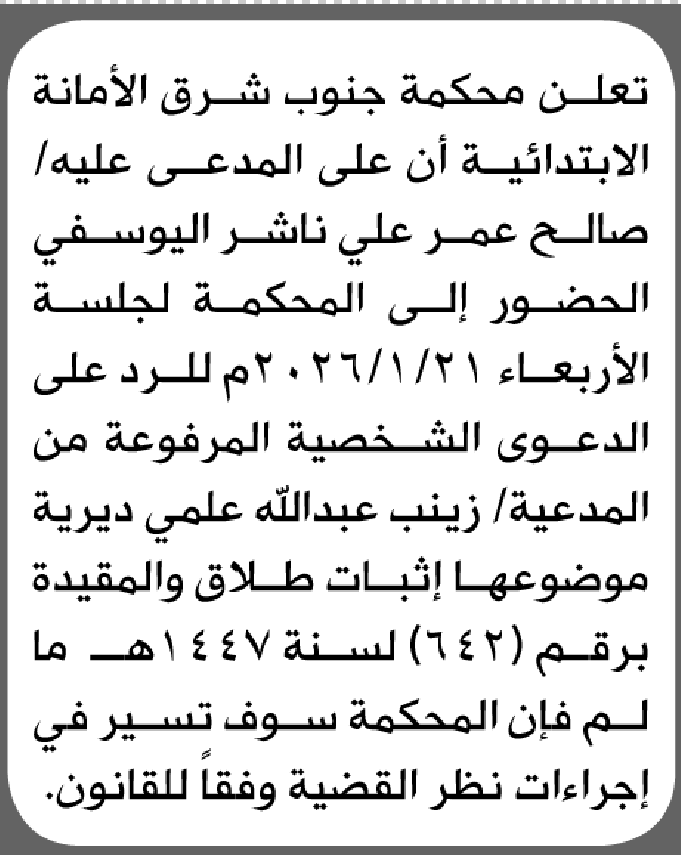 تعلن محكمة جنوب شرق الأمانة أن على المدعى عليه صالح اليوسفي الحضور إلى المحكمة إعلاناتمحاكم On يناير 20, 2026 Share Share FacebookTwitterWhatsAppTelegramGoogle+البريد الإلكترونيPrint