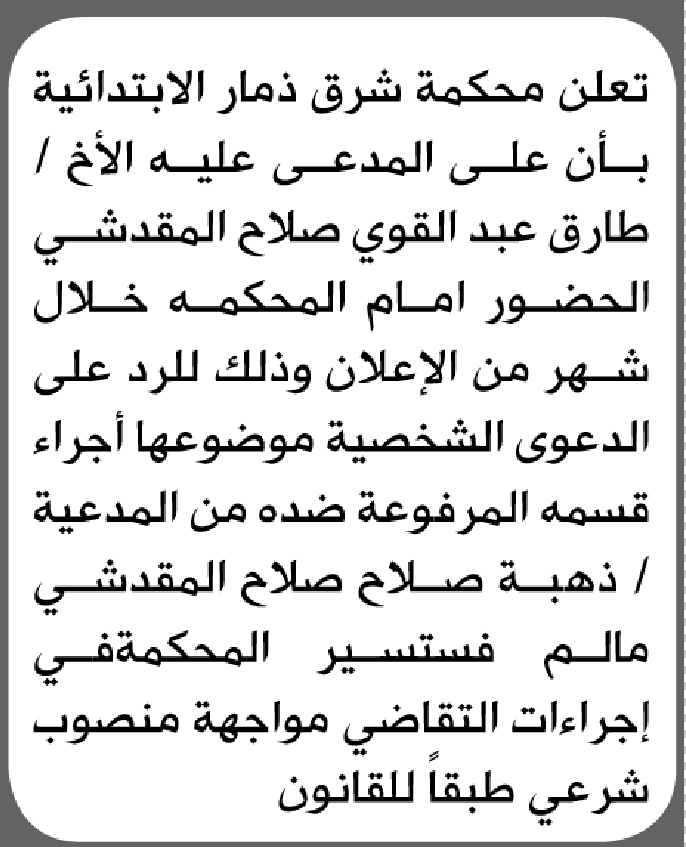 تعلن محكمة شرق ذمار أن على المدعى عليه طارق المقدشي الحضور إلى المحكمة إعلاناتمحاكم On يناير 20, 2026 Share Share FacebookTwitterWhatsAppTelegramGoogle+البريد الإلكترونيPrint