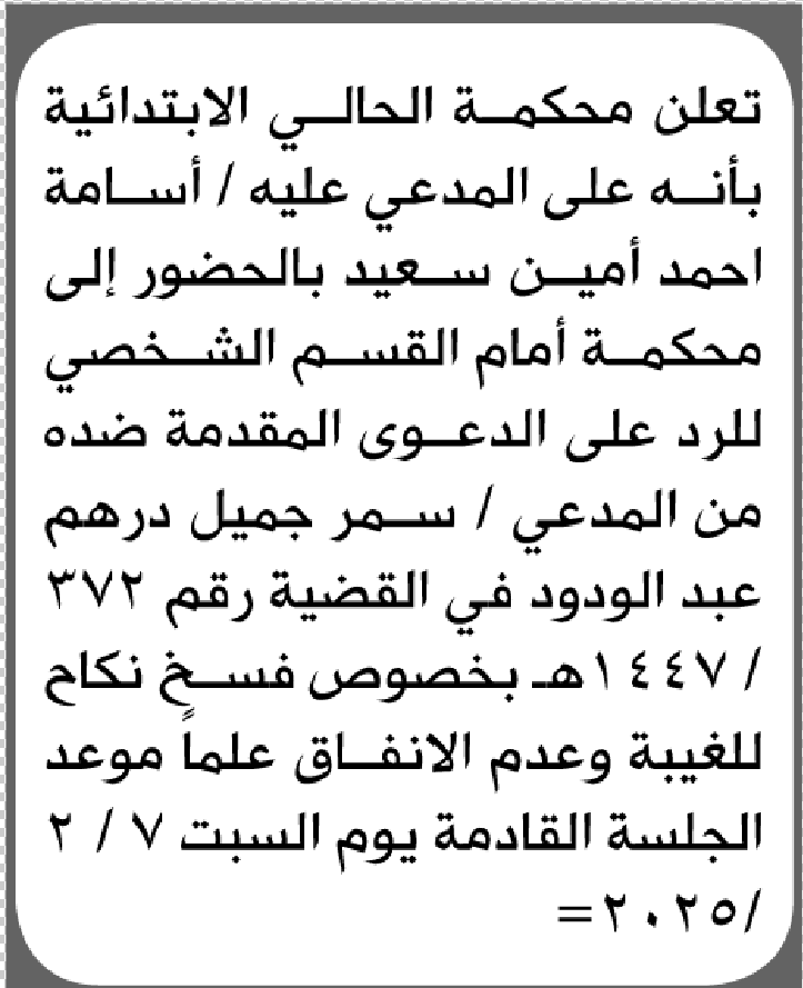 تعلن محكمة الحالي الابتدائية بأن على/ أسامة أحمد سعيد الحضور إلى المحكمة إعلاناتمحاكم On يناير 21, 2026 Share Share FacebookTwitterWhatsAppTelegramGoogle+البريد الإلكترونيPrint
