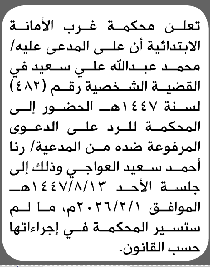 تعلن محكمة غرب الأمانة بأن على/ محمد عبدالله سعيد الحضور إلى المحكمة إعلاناتمحاكم On يناير 21, 2026 Share Share FacebookTwitterWhatsAppTelegramGoogle+البريد الإلكترونيPrint