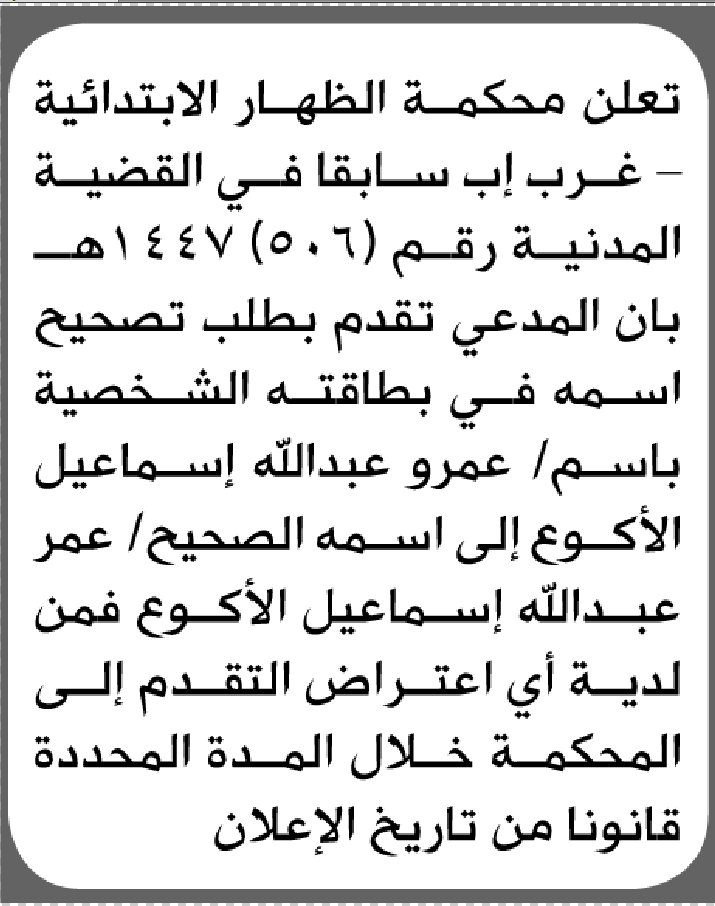تعلن محكمة الظهار الابتدائية بأن الأخ/ عمرو عبدالله الأكوع تقدم إليها بطلب تصحيح اسمه إعلاناتمحاكم On يناير 21, 2026 Share Share FacebookTwitterWhatsAppTelegramGoogle+البريد الإلكترونيPrint