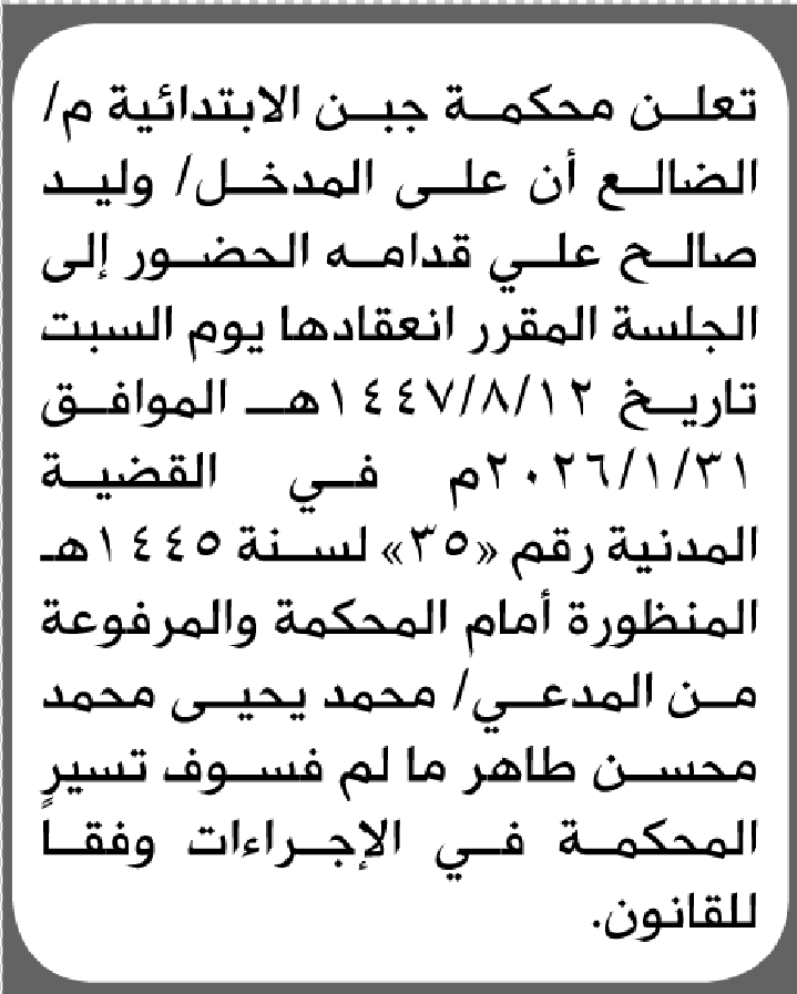 تعلن محكمة جبن أن على المدخل وليد صالح قدامه الحضور إلى المحكمة إعلاناتمحاكم On يناير 21, 2026 Share Share FacebookTwitterWhatsAppTelegramGoogle+البريد الإلكترونيPrint