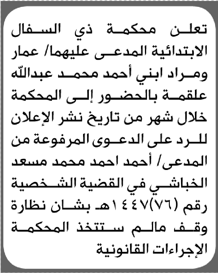 تعلن محكمة ذي السفال أن على المدعى عليهما عمار ومراد أحمد علقمة الحضور إلى المحكمة إعلاناتمحاكم On يناير 21, 2026 Share Share FacebookTwitterWhatsAppTelegramGoogle+البريد الإلكترونيPrint