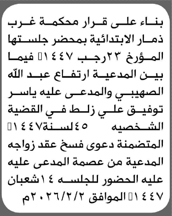 تعلن محكمة غرب ذمار أن على المدعى عليه ياسر زلط الحضور الى المحكمة إعلاناتمحاكم On يناير 21, 2026 Share Share FacebookTwitterWhatsAppTelegramGoogle+البريد الإلكترونيPrint