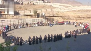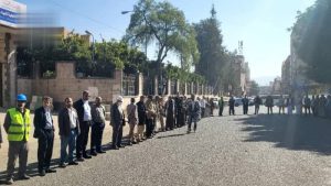 وفي الوقفات، التي نظمها ديوان الأمانة، والمؤسسة المحلية للمياه، صندوق النظافة، ومكاتب المالية، المسالخ، الصحة، الاتصالات، الشؤون الاجتماعية، الاقتصاد والصناعة وفرعا هيئات مكاتب الزكاة، الأراضي، والأوقاف والتأمينات، البيئة، الموارد المائية، وقطاعات الأشغال، النقل، الكهرباء، التربية، ومكتبا الحدائق، الضرائب، رفع المشاركون العلمين اليمني والفلسطيني، ورددّوا شعار البراءة من الأعداء.
