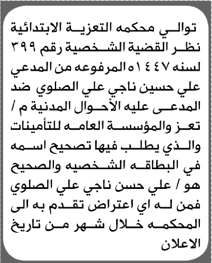 تعلن محكمة التعزية الابتدائية بأن الأخ/ علي حسين الصلوي تقدم إليها بطلب تصحيح اسمه إعلاناتمحاكم On يناير 22, 2026 Share Share FacebookTwitterWhatsAppTelegramGoogle+البريد الإلكترونيPrint