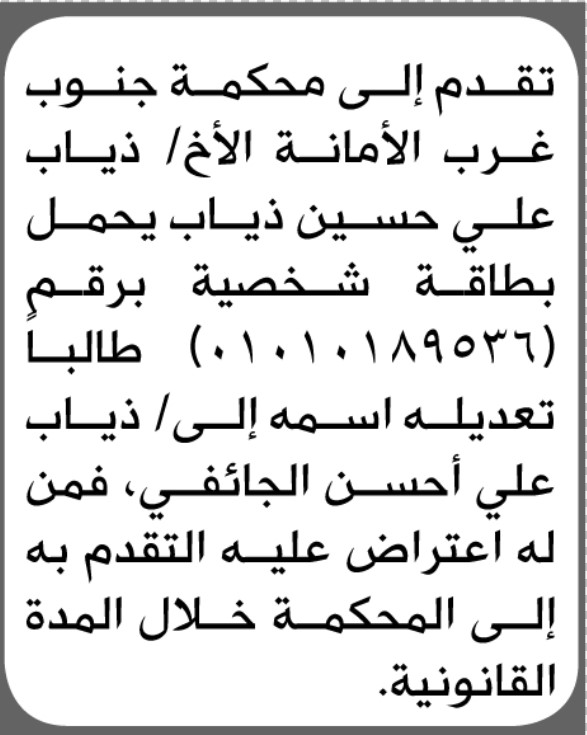 تعلن محكمة جنوب غرب الأمانة بأن الأخ/ ذياب علي ذياب تقدم إليها بطلب تعديل اسمه إعلاناتمحاكم On يناير 23, 2026 Share Share FacebookTwitterWhatsAppTelegramGoogle+البريد الإلكترونيPrint