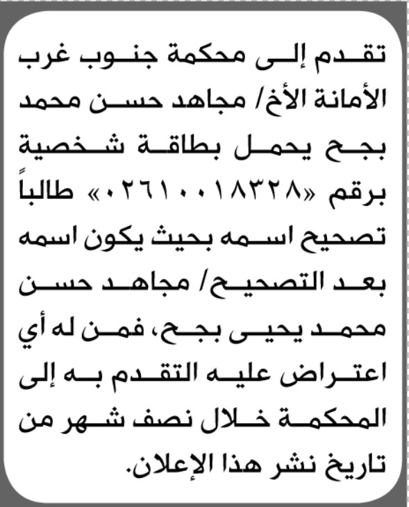 تعلن محكمة جنوب غرب الأمانة بأن الأخ/ مجاهد حسن بجح تقدم إليها بطلب تصحيح اسمه إعلاناتمحاكم On يناير 23, 2026 Share Share FacebookTwitterWhatsAppTelegramGoogle+البريد الإلكترونيPrint