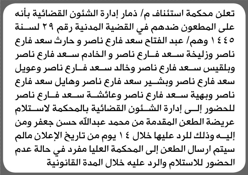 تعلن محكمة استئناف ذمار أن على المطعون ضدهم عبدالفتاح سعد وآخرين الحضور إلى المحكمة إعلاناتمحاكم On يناير 23, 2026 Share Share FacebookTwitterWhatsAppTelegramGoogle+البريد الإلكترونيPrint