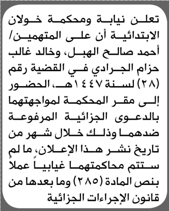 تعلن نيابة ومحكمة خولان أن على المتهمين أحمد الهبل وآخر الحضور إلى المحكمة إعلاناتمحاكم On يناير 23, 2026 Share Share FacebookTwitterWhatsAppTelegramGoogle+البريد الإلكترونيPrint