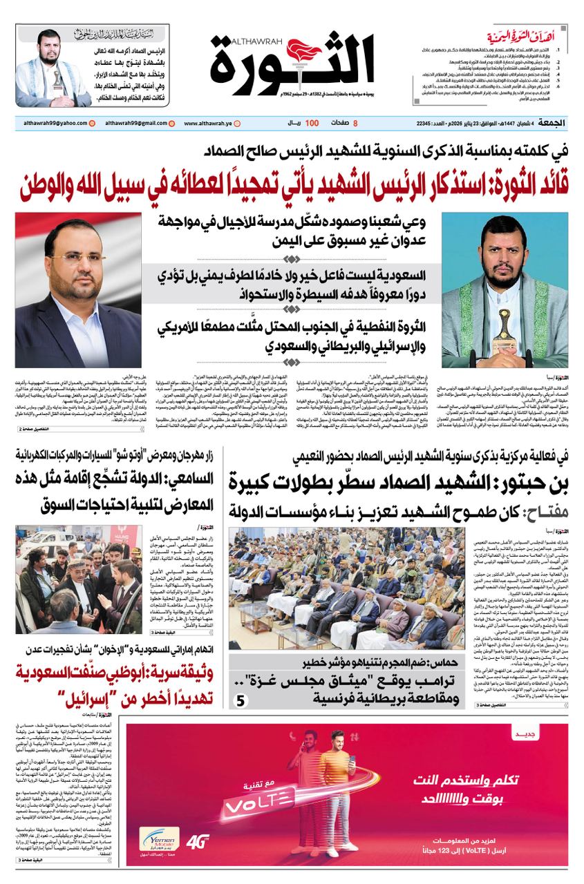 الصحيفة الورقية صحيفة الثورة الجمعة 4 شعبان 1447 – 23 يناير 2026 On يناير 22, 2026 Share View Fullscreen Share FacebookTwitterWhatsAppTelegramGoogle+البريد الإلكترونيPrint