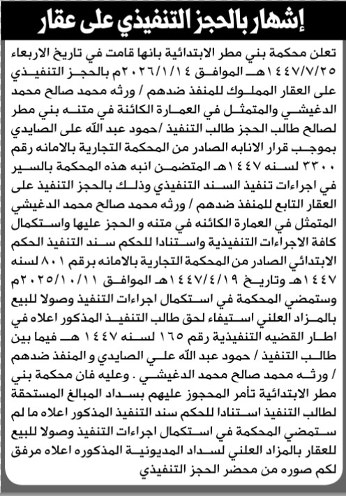 تعلن محكمة بني مطر عن حجز العقار التابع للمنفذ ضدهم ورثة محمد صالح الدغيشي إعلاناتمحاكم On يناير 24, 2026 Share Share FacebookTwitterWhatsAppTelegramGoogle+البريد الإلكترونيPrint