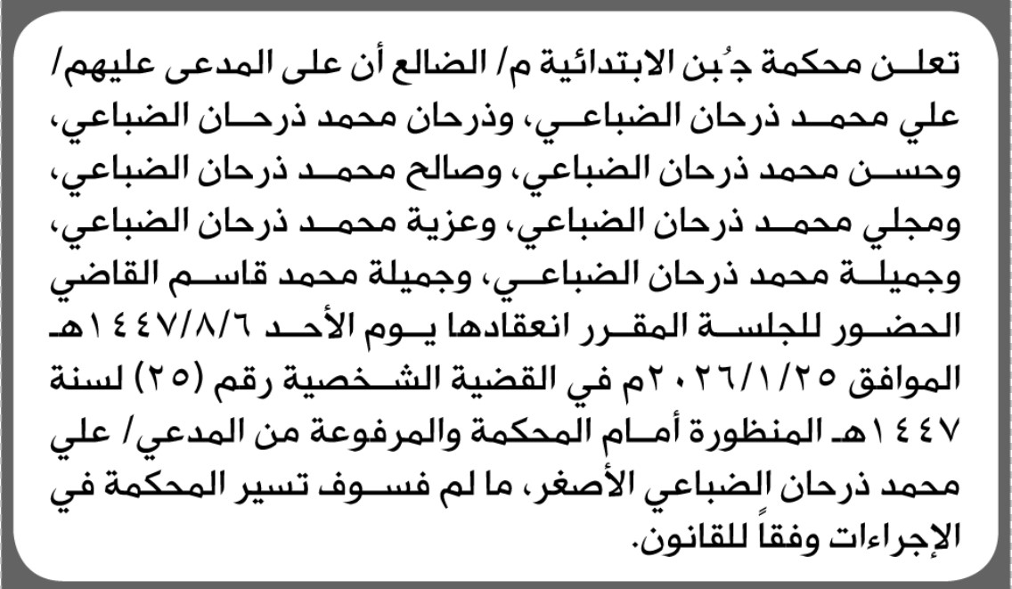 تعلن محكمة جبن أن على المدعى عليهم علي الضباعي وآخرين الحضور إلى المحكمة إعلاناتمحاكم On يناير 24, 2026 Share Share FacebookTwitterWhatsAppTelegramGoogle+البريد الإلكترونيPrint