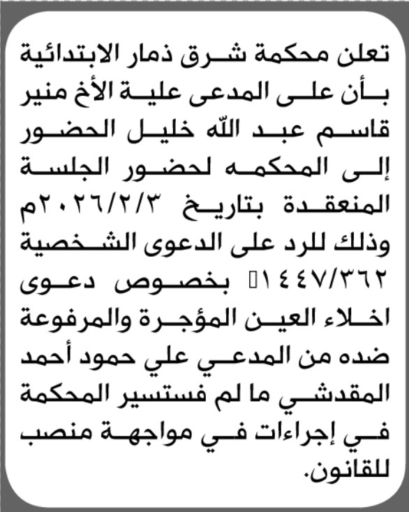 تعلن محكمة شرق ذمار أن على المدعى عليه منير خليل الحضور إلى المحكمة إعلاناتمحاكم On يناير 24, 2026 Share Share FacebookTwitterWhatsAppTelegramGoogle+البريد الإلكترونيPrint