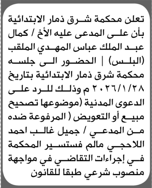 تعلن محكمة شرق ذمار أن على المدعى عليه كمال المهدي الحضور إلى المحكمة إعلاناتمحاكم On يناير 24, 2026 Share Share FacebookTwitterWhatsAppTelegramGoogle+البريد الإلكترونيPrint