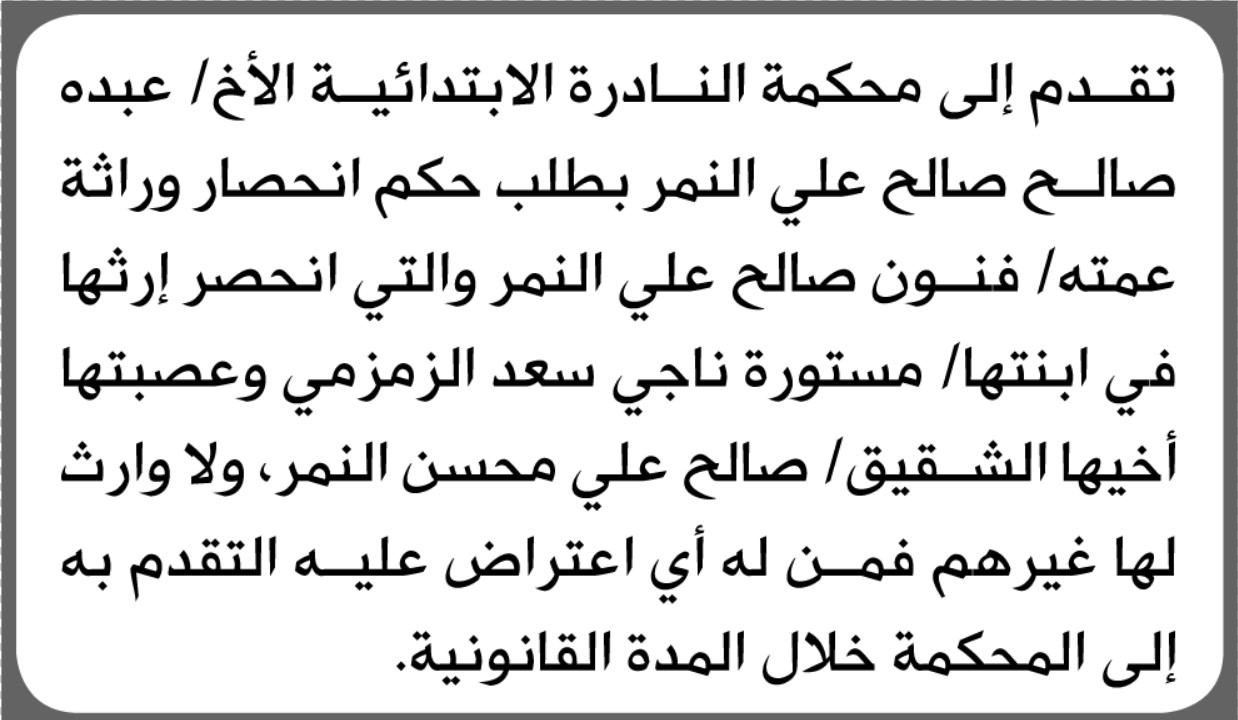 تقدم إلى محكمة النادرة عبده النمر بطلب حكم إنحصار وراثة إعلاناتمحاكم On يناير 25, 2026 Share Share FacebookTwitterWhatsAppTelegramGoogle+البريد الإلكترونيPrint