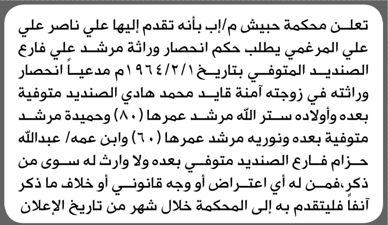 تعلن محكمة حبيش م/ إب بأن الأخ/ علي ناصر المرغمي تقدم إليها بطلب انحصار وراثة إعلاناتمحاكم On يناير 25, 2026 Share Share FacebookTwitterWhatsAppTelegramGoogle+البريد الإلكترونيPrint