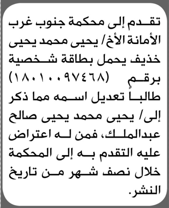 تعلن محكمة جنوب غرب الأمانة بأن الأخ/ يحيى محمد خذيف تقدم إليها بطلب تعديل اسمه إعلاناتمحاكم On يناير 25, 2026 Share Share FacebookTwitterWhatsAppTelegramGoogle+البريد الإلكترونيPrint