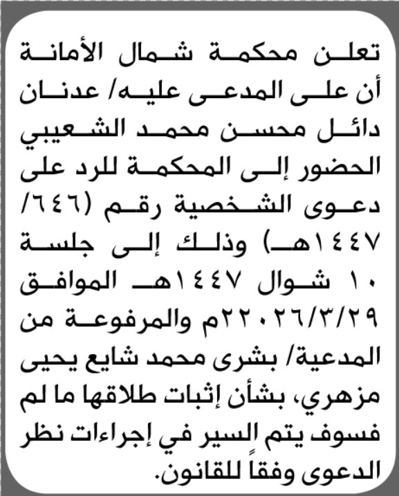 تعلن محكمة شمال الأمانة بأن على/ عدنان دائل الشعيبي الحضور إلى المحكمة إعلاناتمحاكم On يناير 25, 2026 Share Share FacebookTwitterWhatsAppTelegramGoogle+البريد الإلكترونيPrint