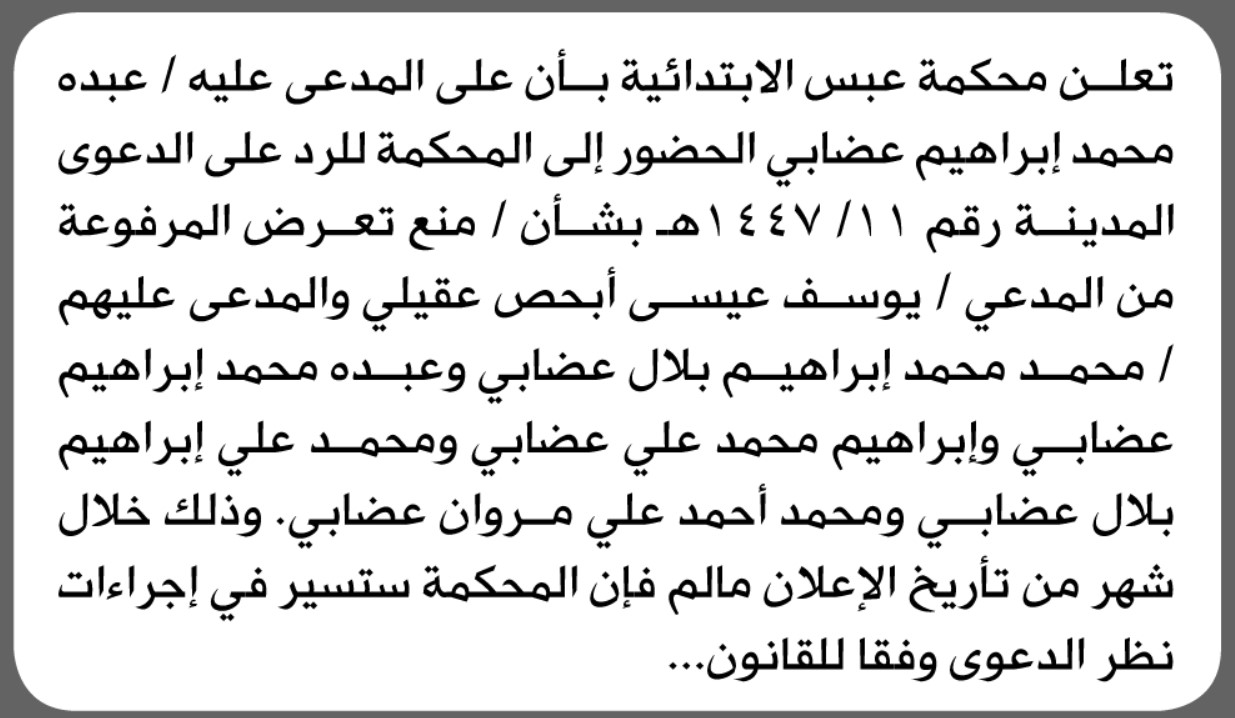 تعلن محكمة عبس الابتدائية بأن على/ عبده محمد عضابي الحضور إلى المحكمة إعلاناتمحاكم On يناير 25, 2026 Share Share FacebookTwitterWhatsAppTelegramGoogle+البريد الإلكترونيPrint