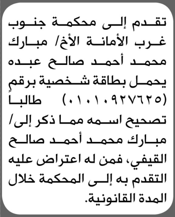 تعلن محكمة جنوب غرب الأمانة بأن الأخ/ مبارك محمد عبده تقدم إليها بطلب تصحيح اسمه إعلاناتمحاكم On يناير 25, 2026 Share Share FacebookTwitterWhatsAppTelegramGoogle+البريد الإلكترونيPrint