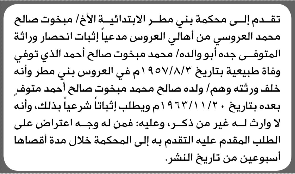 تعلن محكمة بني مطر الابتدائية بأن الأخ/ مبخوت صالح العروسي تقدم إليها بطلب انحصار وراثة إعلاناتمحاكم On يناير 25, 2026 Share Share FacebookTwitterWhatsAppTelegramGoogle+البريد الإلكترونيPrint