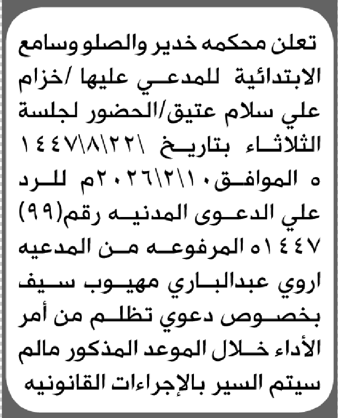 تعلن محكمة خدير والصلو وسامع الابتدائية بأن على/ خزام علي عتيق الحضور إلى المحكمة إعلاناتمحاكم On يناير 26, 2026 Share Share FacebookTwitterWhatsAppTelegramGoogle+البريد الإلكترونيPrint
