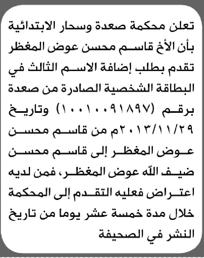 تعلن محكمة صعدة وسحار الابتدائية بأن الأخ/ قاسم محسن المغظر تقدم إليها بطلب إضافة اسم إعلاناتمحاكم On يناير 26, 2026 Share Share FacebookTwitterWhatsAppTelegramGoogle+البريد الإلكترونيPrint