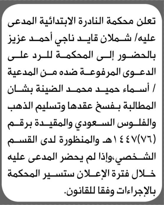 تعلن محكمة النادرة أن على المدعى عليه شملان قايد عزيز الحضور إلى المحكمة إعلاناتمحاكم On يناير 27, 2026 Share Share FacebookTwitterWhatsAppTelegramGoogle+البريد الإلكترونيPrint