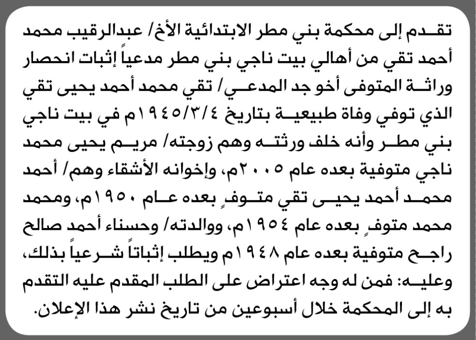 تعلن محكمة بني مطر الابتدائية بأن الأخ/ عبدالرقيب محمد تقي تقدم إليها بطلب انحصار وراثة إعلاناتمحاكم On يناير 27, 2026 Share Share FacebookTwitterWhatsAppTelegramGoogle+البريد الإلكترونيPrint