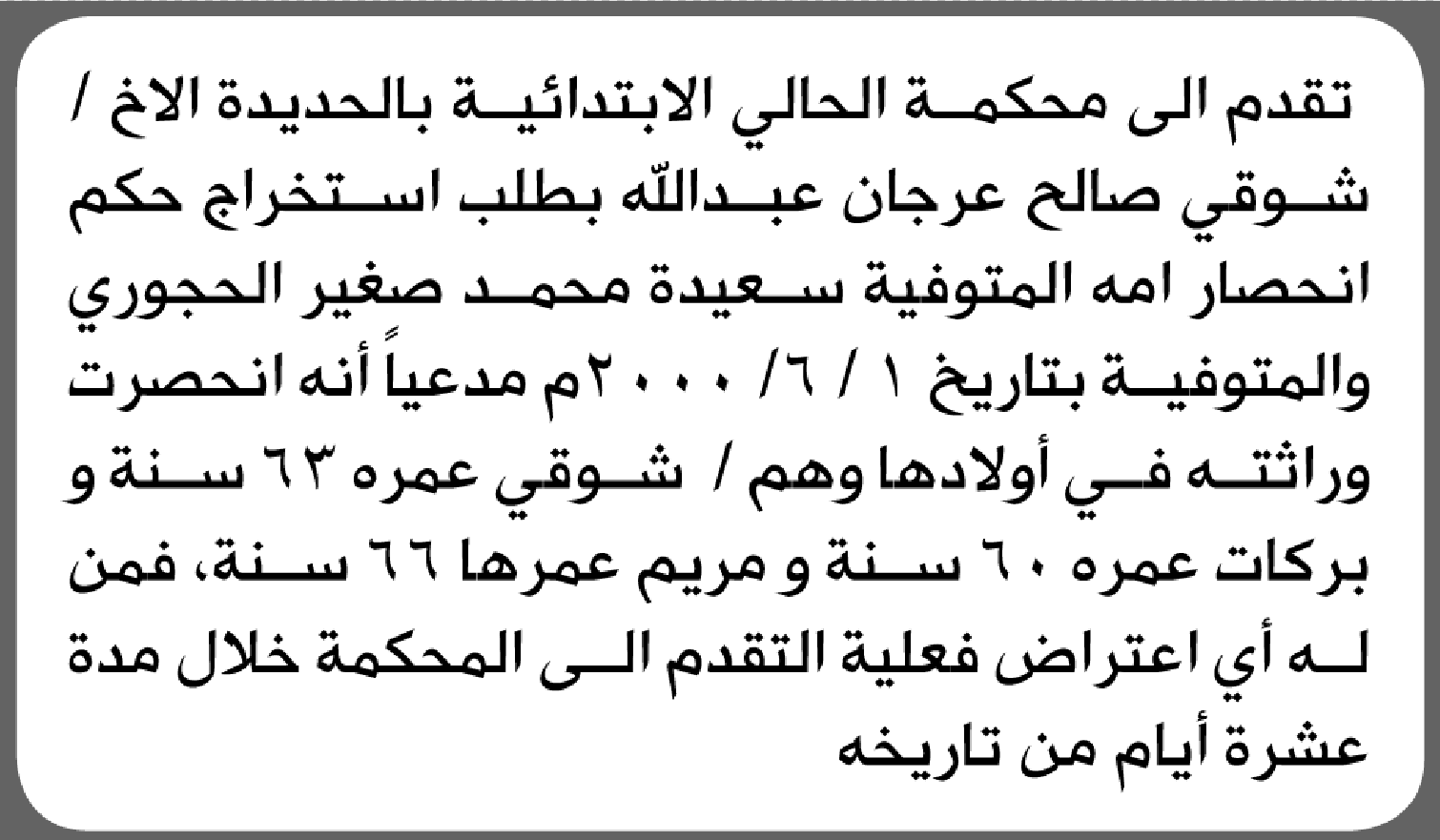 تعلن محكمة الحالي أن الأخ شوقي صالح عرجان تقدم بدعوى انحصار وراثة إعلاناتمحاكم On يناير 28, 2026 Share Share FacebookTwitterWhatsAppTelegramGoogle+البريد الإلكترونيPrint