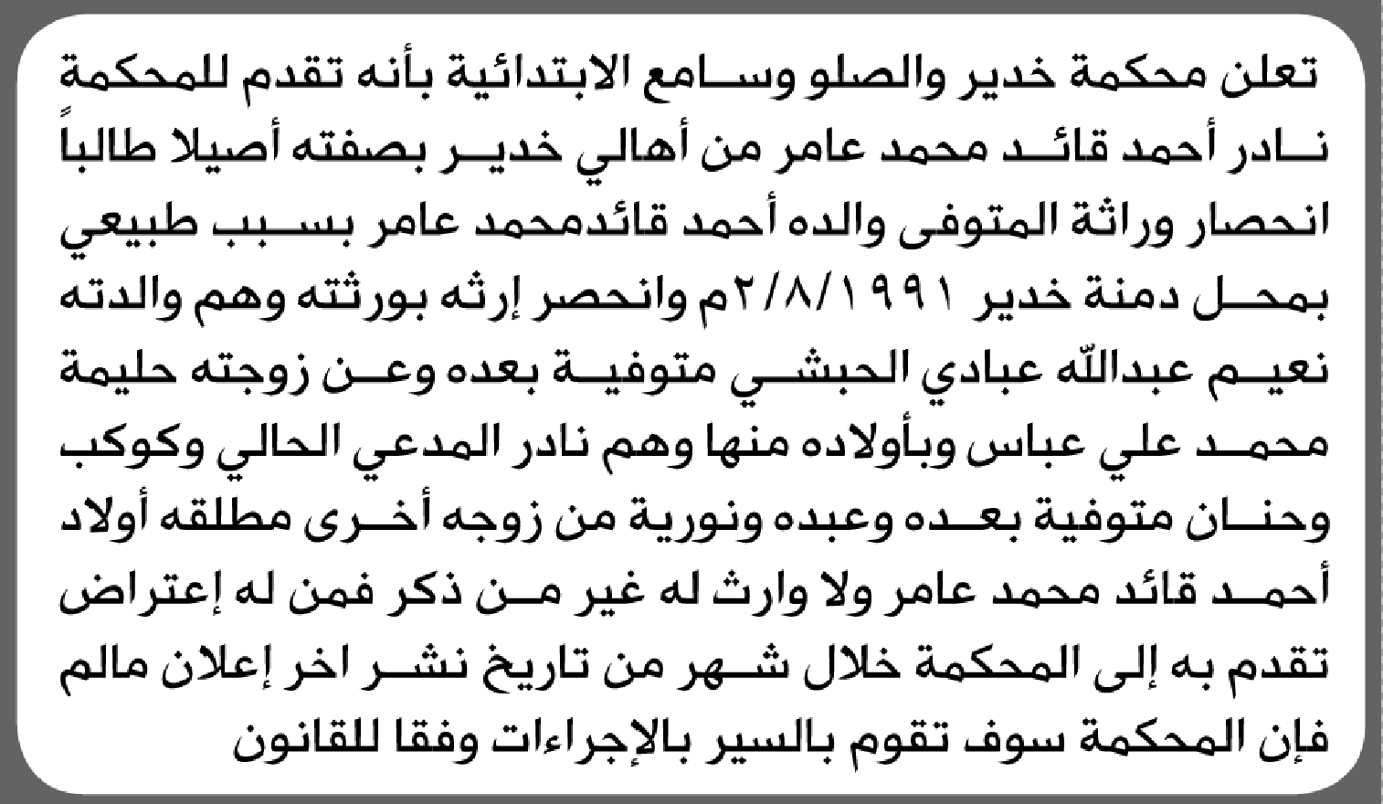 تعلن محكمة خدير أن الأخ نادر أحمد قائد تقدم بدعوى انحصار وراثة إعلاناتمحاكم On يناير 28, 2026 Share Share FacebookTwitterWhatsAppTelegramGoogle+البريد الإلكترونيPrint