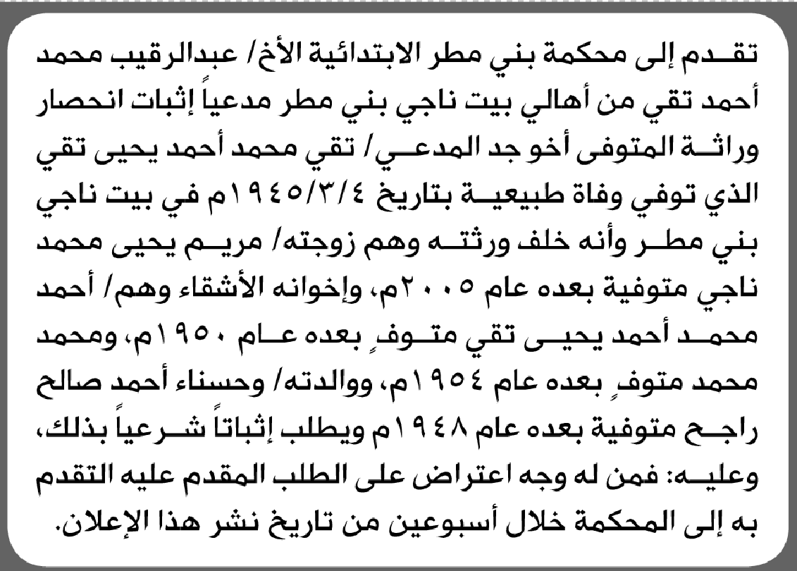 تعلن محكمة بني مطر الابتدائية بأن الاخ/ عبدالرقيب محمد تقي تقدم إليها بطلب انحصار وراثة إعلاناتمحاكم On يناير 28, 2026 Share Share FacebookTwitterWhatsAppTelegramGoogle+البريد الإلكترونيPrint