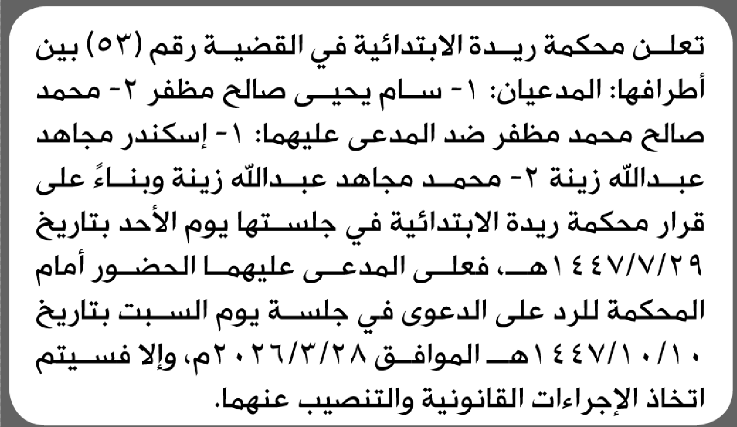 تعلن محكمة ريدة الابتدائية بأن على/ سام يحيى مظفر وآخرين الحضور إلى المحكمة إعلاناتمحاكم On يناير 28, 2026 Share Share FacebookTwitterWhatsAppTelegramGoogle+البريد الإلكترونيPrint