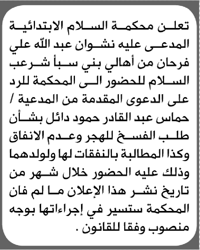 تعلن محكمة السلام أن على المدعى عليه نشوان فرحان الحضور إلى المحكمة إعلاناتمحاكم On يناير 30, 2026 Share Share FacebookTwitterWhatsAppTelegramGoogle+البريد الإلكترونيPrint