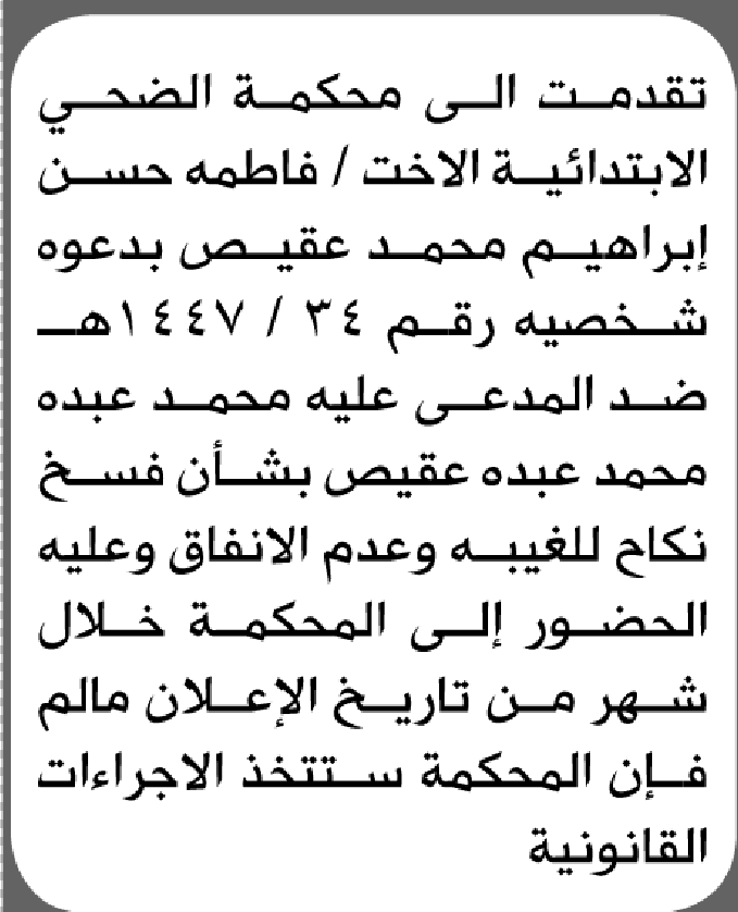 تعلن محكمة الضحي أن على المدعى عليه محمد عقيص الحضور إلى المحكمة إعلاناتمحاكم On يناير 30, 2026 Share Share FacebookTwitterWhatsAppTelegramGoogle+البريد الإلكترونيPrint