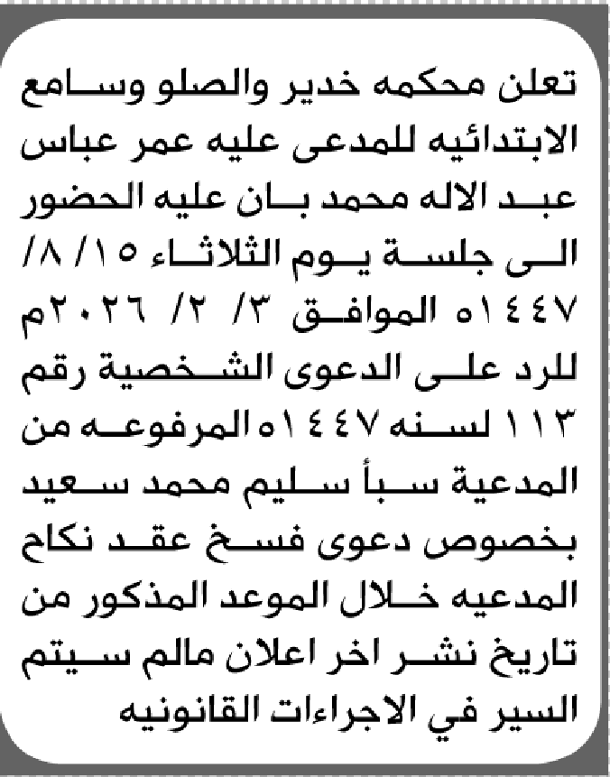 تعلن محكمة خدير أن على المدعى عليه عمر عباس عبدالإله الحضور إلى المحكمة إعلاناتمحاكم On يناير 30, 2026 Share Share FacebookTwitterWhatsAppTelegramGoogle+البريد الإلكترونيPrint