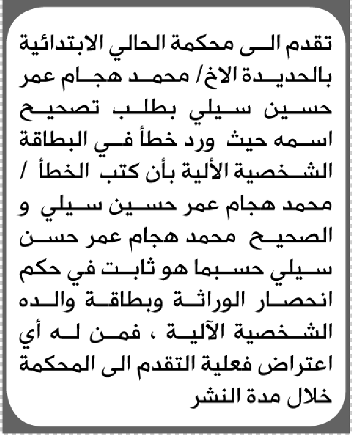 تقدم إلى محكمة الحالي محمد سيلي بطلب إنحصار وراثة إعلاناتمحاكم On يناير 30, 2026 Share Share FacebookTwitterWhatsAppTelegramGoogle+البريد الإلكترونيPrint