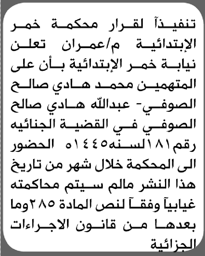 تعلن نيابة خمر م/عمران بأن على المتهمين محمد الصوفي الحضور الى المحكمة إعلاناتمحاكم On يناير 30, 2026 Share Share FacebookTwitterWhatsAppTelegramGoogle+البريد الإلكترونيPrint