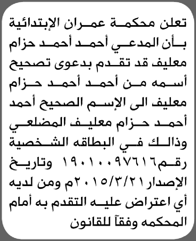 تعلن محكمة عمران بأن على المدعي احمد معليف تقدم بطلب تصحيح اسم إعلاناتمحاكم On يناير 30, 2026 Share Share FacebookTwitterWhatsAppTelegramGoogle+البريد الإلكترونيPrint
