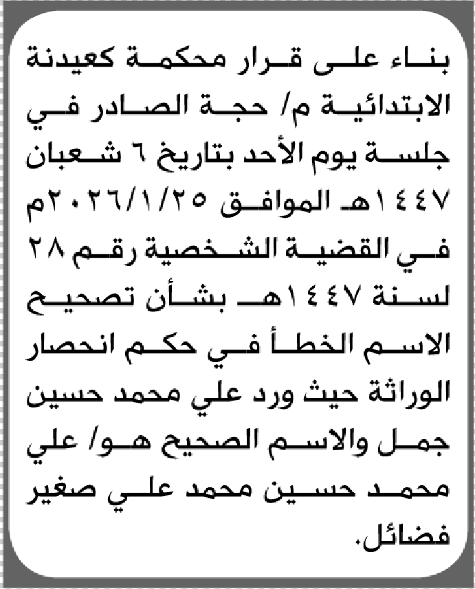 تعلن محكمة كعيدنة م/حجة أن علي جمل تقدم بطلب تصحيح اسم إعلاناتمحاكم On يناير 30, 2026 Share Share FacebookTwitterWhatsAppTelegramGoogle+البريد الإلكترونيPrint